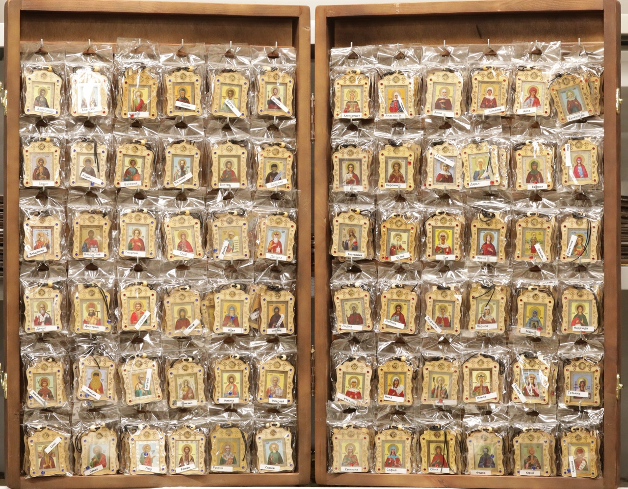 Шкаф - витрина (ERM) переносной с комплектом именных икон с подставкой 4х3,5см, 72 вида по 3шт купить оптом от производителя