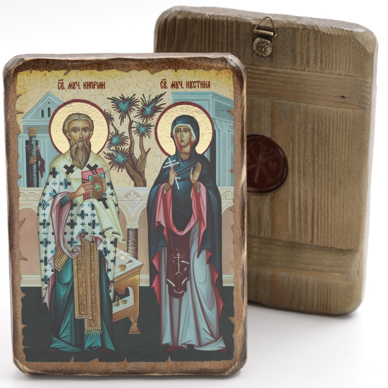 Икона 13x17 (ERM) деревянная под старину, Киприан и Иустина купить оптом от производителя