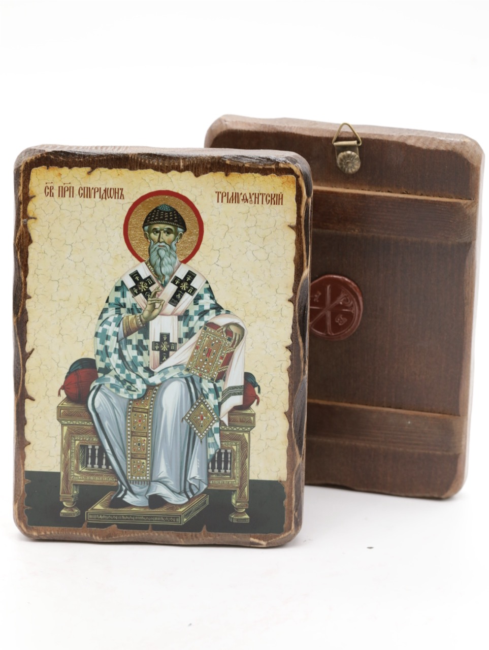 Икона 13x17 (ERM) деревянная под старину, Спиридон (на троне в белом) купить оптом от производителя