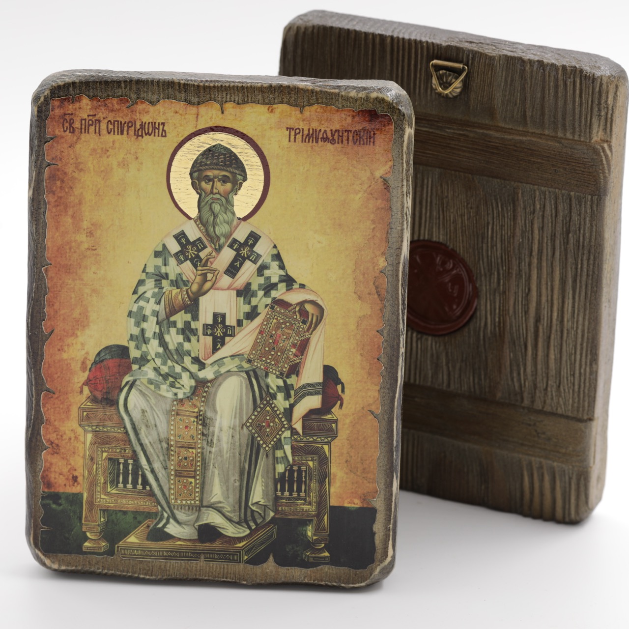 Икона 13х17 (ERM) деревянная под старину с ОБЖИГОМ, Спиридон на троне купить оптом от производителя