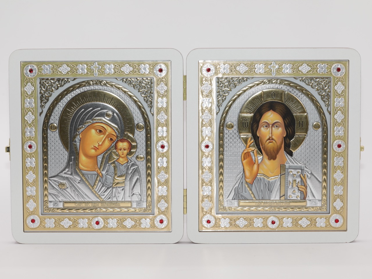 Складень (ERM) 15x18 БЕЛЫЙ вставка металл со стразами, Спаситель - Казанская №8 купить оптом от производителя