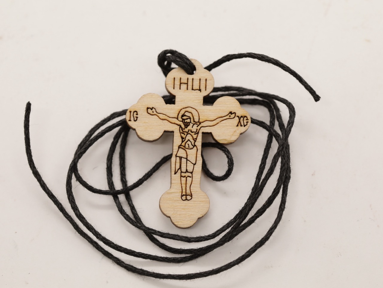 Крестик деревянный (ERM), Спаси и сохрани, 35мм (с гайтаном), фигурный купить оптом от производителя